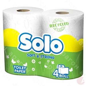 Туалетная бумага Solo. Двухслойная основа туалетной бумаги обеспечивает оптимальное соотношение качественных характеристик, таких как мягкость и высокие поглощающие свойства. Цвет - белый. В полиэтиленовой упаковке 4 рулона.